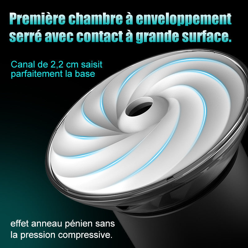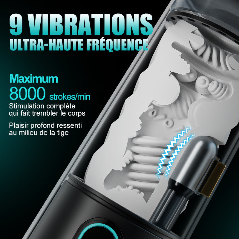- Succion à 9 Niveaux & Vibration 8000 TR/Min — Système breveté à deux étages pour constriction profonde de la gorge et stimulation complète du manche.